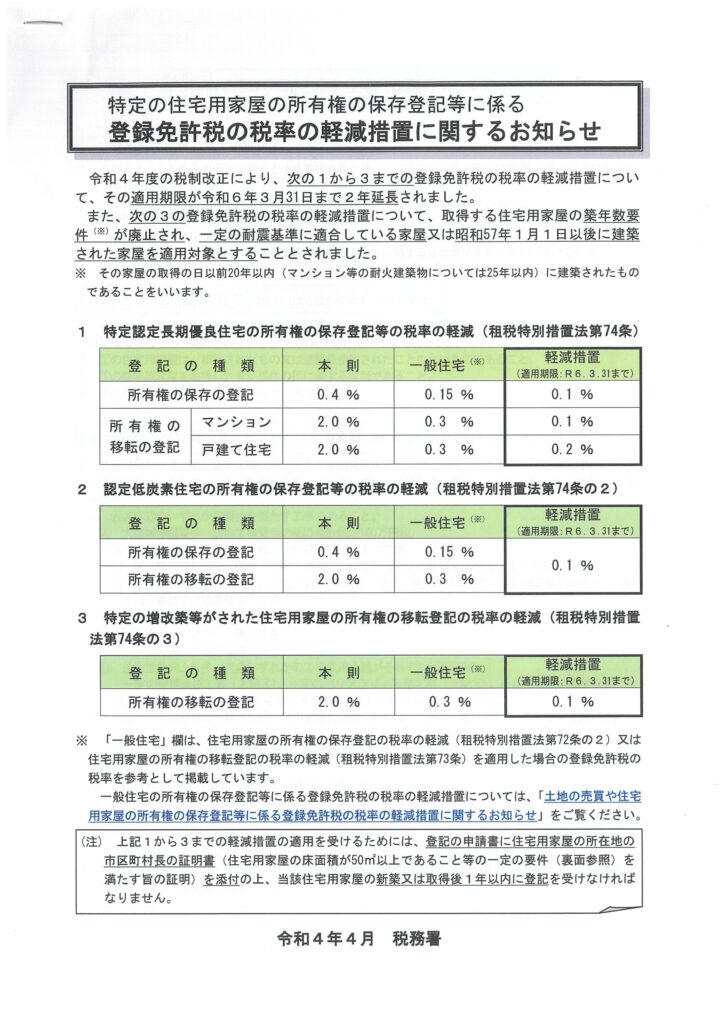 住宅ローン控除における築年数の要件が撤廃される事が周知されましたが、あまり知られていないのが今回ご説明する登記費用の軽減処置についてです。脱炭素社会に向けて等の取組みは税制にも大きく反映されている裏返しでしょう。
